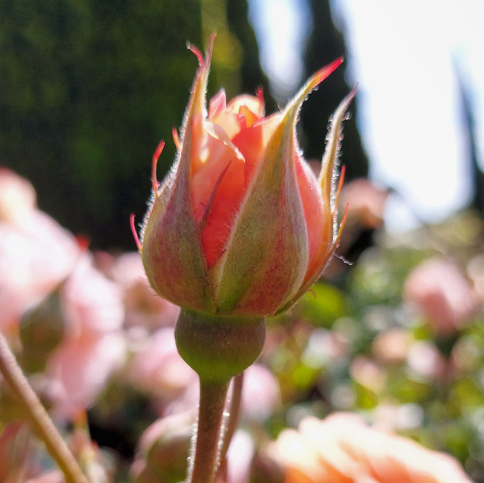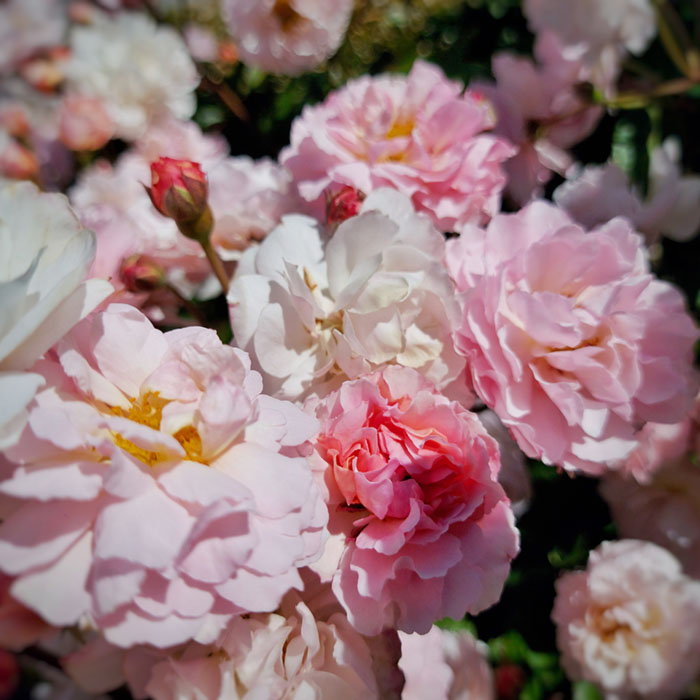 The rose garden features 56 geometric beds radiating from a central pergola. These beds contain representatives from almost every major rose family in the world, allowing visitors to trace the lineage and evolution of roses through the centuries. The roses are arranged in a gradient of colours, starting with soft pinks and transitioning through crimsons, apricots, yellows, and golds. English roses were planted in groups of two or three to ensure continuous flowering.
