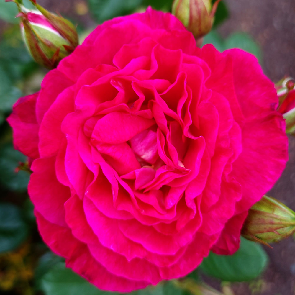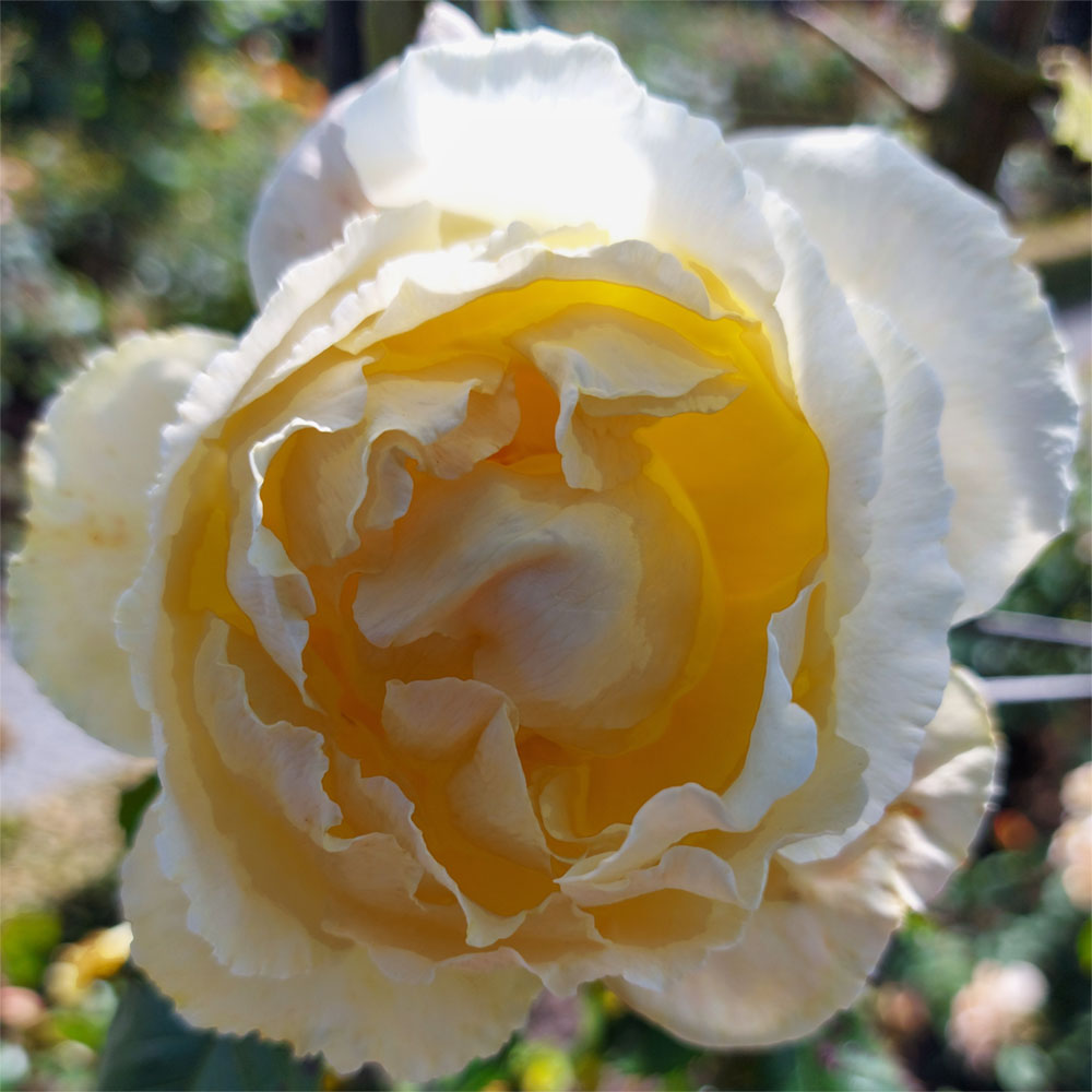 Blooms with high number of petals tucked into cup shaped scalloped flower, 4 equal parts