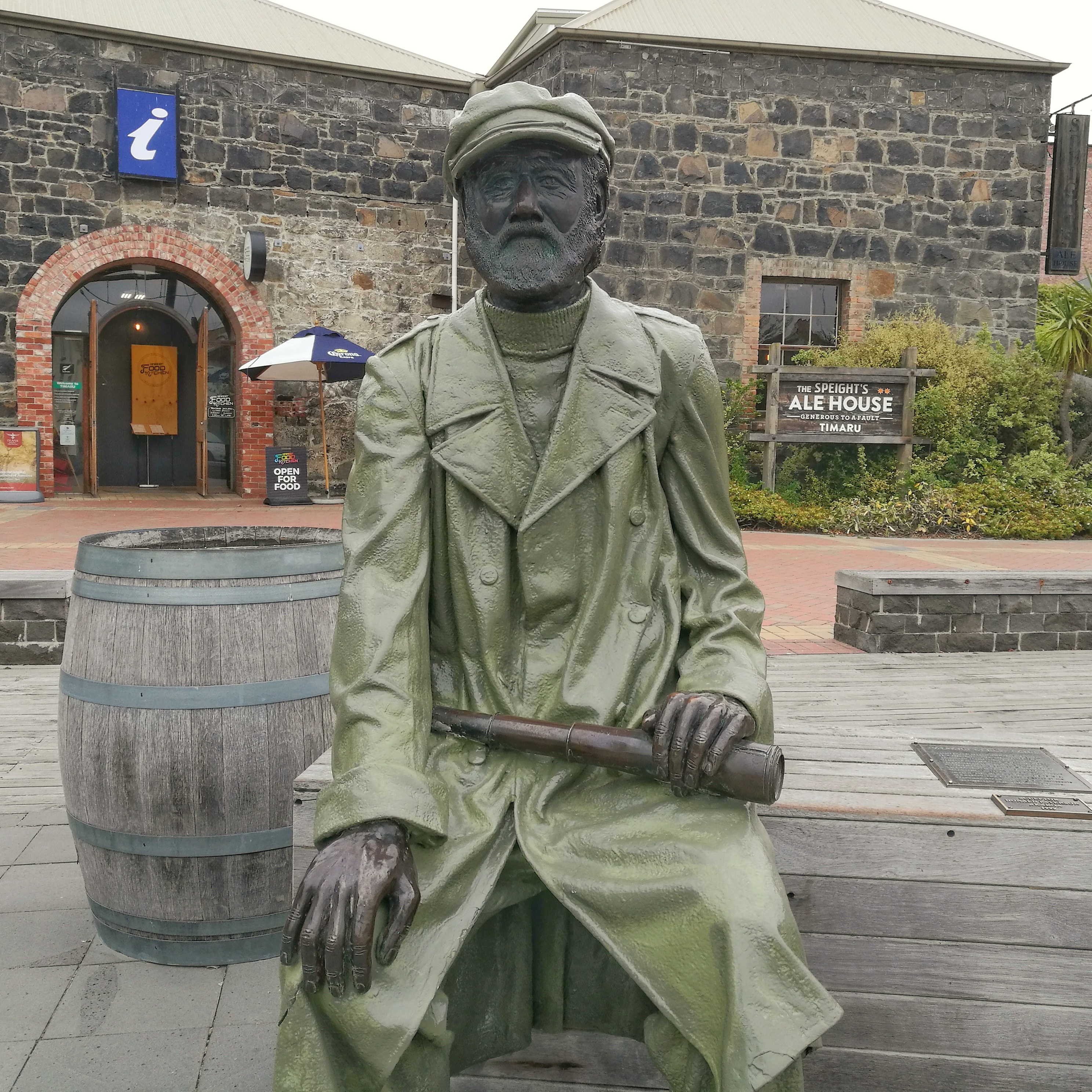 A memorial of Captain Henry Cain (1816 -1886) sits resting on cargo crates. He was one of Timaru's earliest colonial residents, he a store on this site and later became Mayor of Timaru. Sadly he was murdered by his son in law. His wife Mrs Cain turned the first sod at this end of the Timaru-Christchurch railway. They had a cottage on the shore. She recalled the first immigrant ship to sail direct to Timaru arriving. It brought 110 souls, a significant boost to the Timaru population. A couple of days after they landed a few guys took off on a food gathering expedition, they proudly carried back some birds for dinner, only to be greeted by Mrs Cain laughing at them as their catch was a in edible salty bird called the shag.
